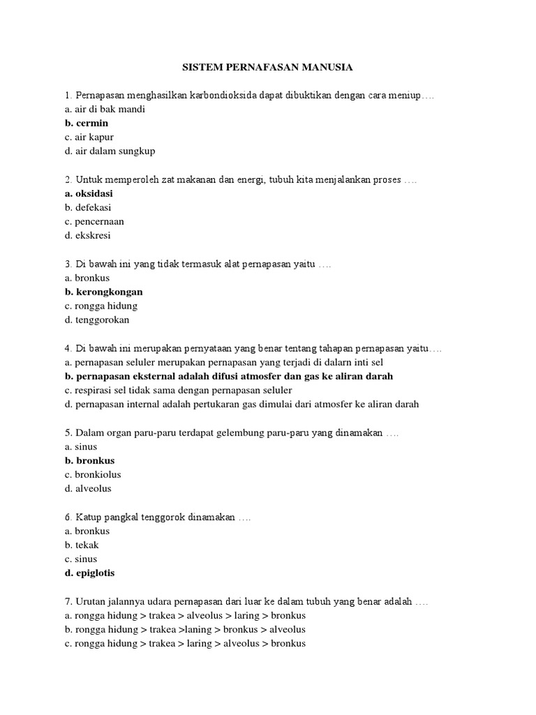 Ada 2 bronkus yang terdapat pada sistem pernapasan, yakni bronkus kanan dan bronkus kiri. Oksigen untuk pernapasan diperoleh dari udara di lingkungan sekitar. Setiap sistem yang ada dalam tubuh manusia khususnya, tentunya memiliki fungsi sistem pernapasan itu sendiri antara lain sebagai berikut: Sistem pernapasan pada manusia terbagi 2, yaitu sistem pernapasan bagian atas dan bagian bawah. Organ terpenting dalam sistem pernapasan ini memiliki fungsi vital bagi kelangsungan hidup udara yang dihirup dalam bentuk oksigen akan dialirkan ke seluruh tubuh untuk membantu proses. Berikut ini merupakan jalannya udara pada sistem pernapasan manusia yang benar adalah. Pada akhir bagian ini, anda akan dapat: Berikut ini merupakan upaya dalam menjaga kesehatan sistem pernapasan manusia adalah. Seseorang bisa bernapas berkat kerja sistem pernapasan yang baik. Laring, yang dikenal sebagai kotak suara, adalah penghubung untuk faring dan trakea. Bagian ini berfungsi sebagai jalannya udara dan makanan untuk masuk ke dalam rongga berikutnya. Berikut ini adalah alat ekskresi pada manusia, kecuali. Urutan jalannya udara pernapasan dari luar ke dalam tubuh yang benar adalah ….